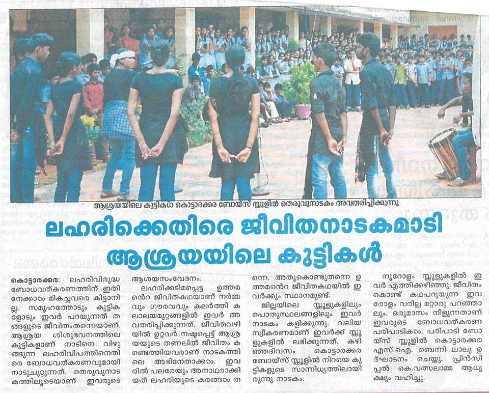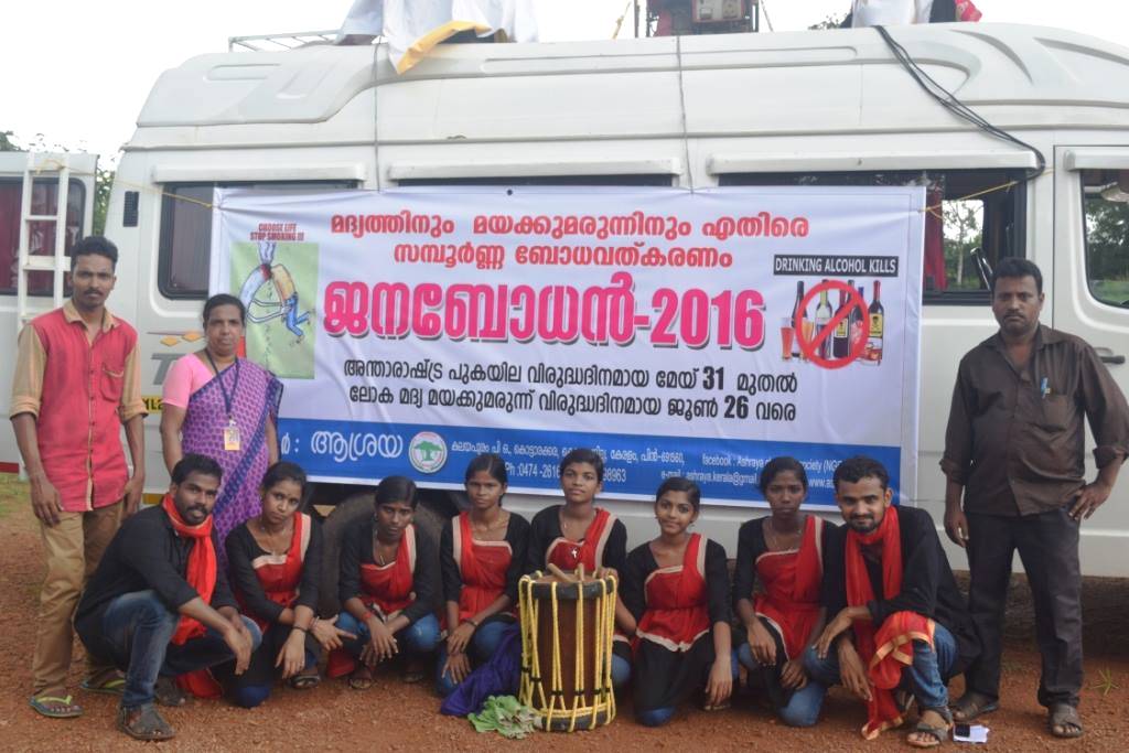 Substance abuse is assuming viral dimensions in the society resulting in breaking down of families and thus generating destitution of its members apart from sapping creativity of the youth therein. Realising its gravity Ashraya moved to JANBODHAN programme- an on-going campaigning against substance abuse for the last two decades. The message of the hazards of substance abuse is driven mainly in the minds of school children as they would make tomorrow’s society. A street play carrying the message of hazards of substance abuse is enacted by the inmates of Sisubhavan at the school premises. It commences on the World Tobacco Day on 31 May and lasts till 06 July of every year.The team visited over 100 schools during 2015-16 and its culmination was a huge Rallyof over 3000 members consisting of the students of Kottarakkara education district, student police, NCC, Scoutsand Guides, Red Cross, Jana Maithri Police, Residential Association, KudumbaSree, and bigwigs from Political, Police, socio-cultural fields.